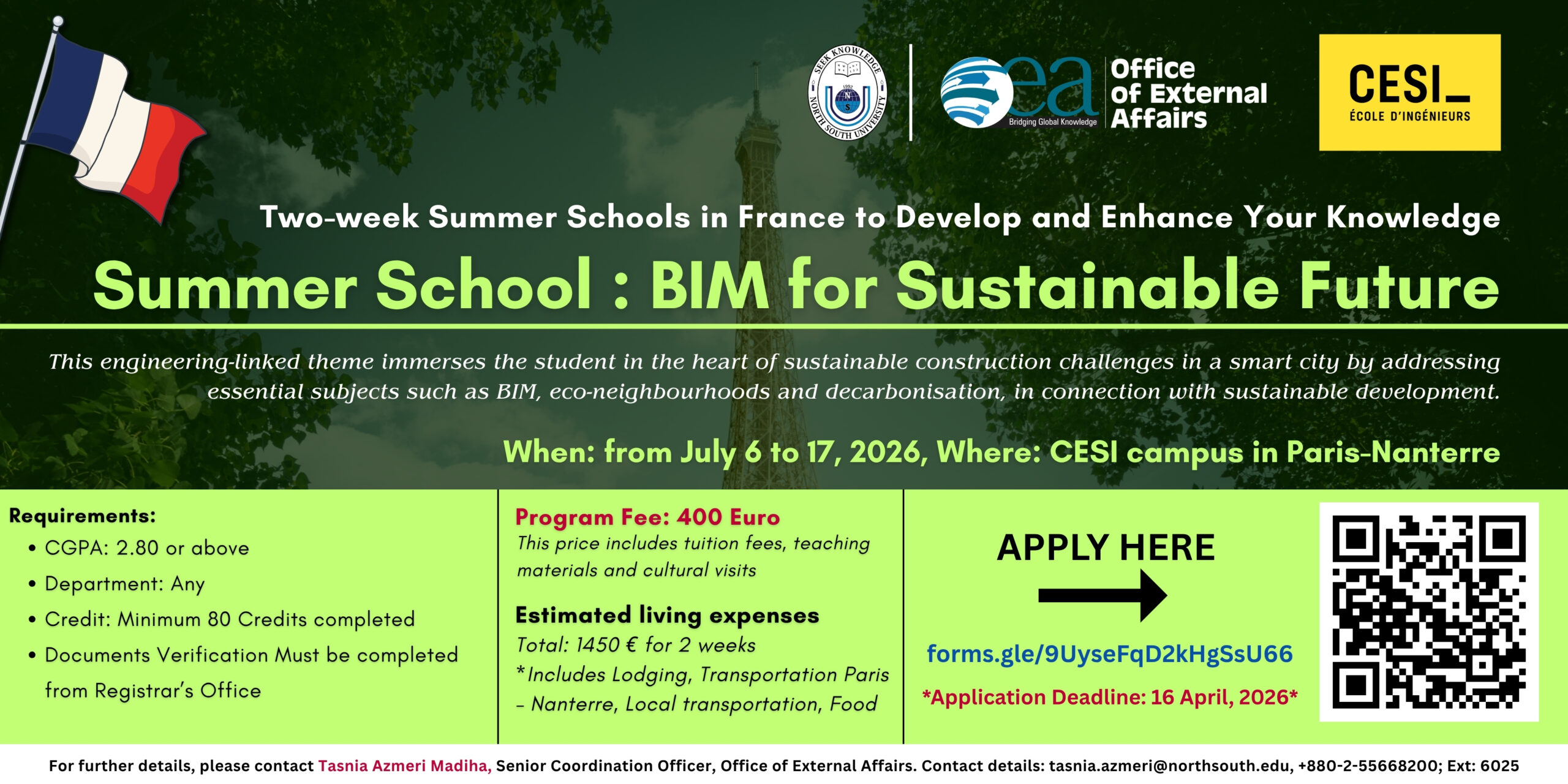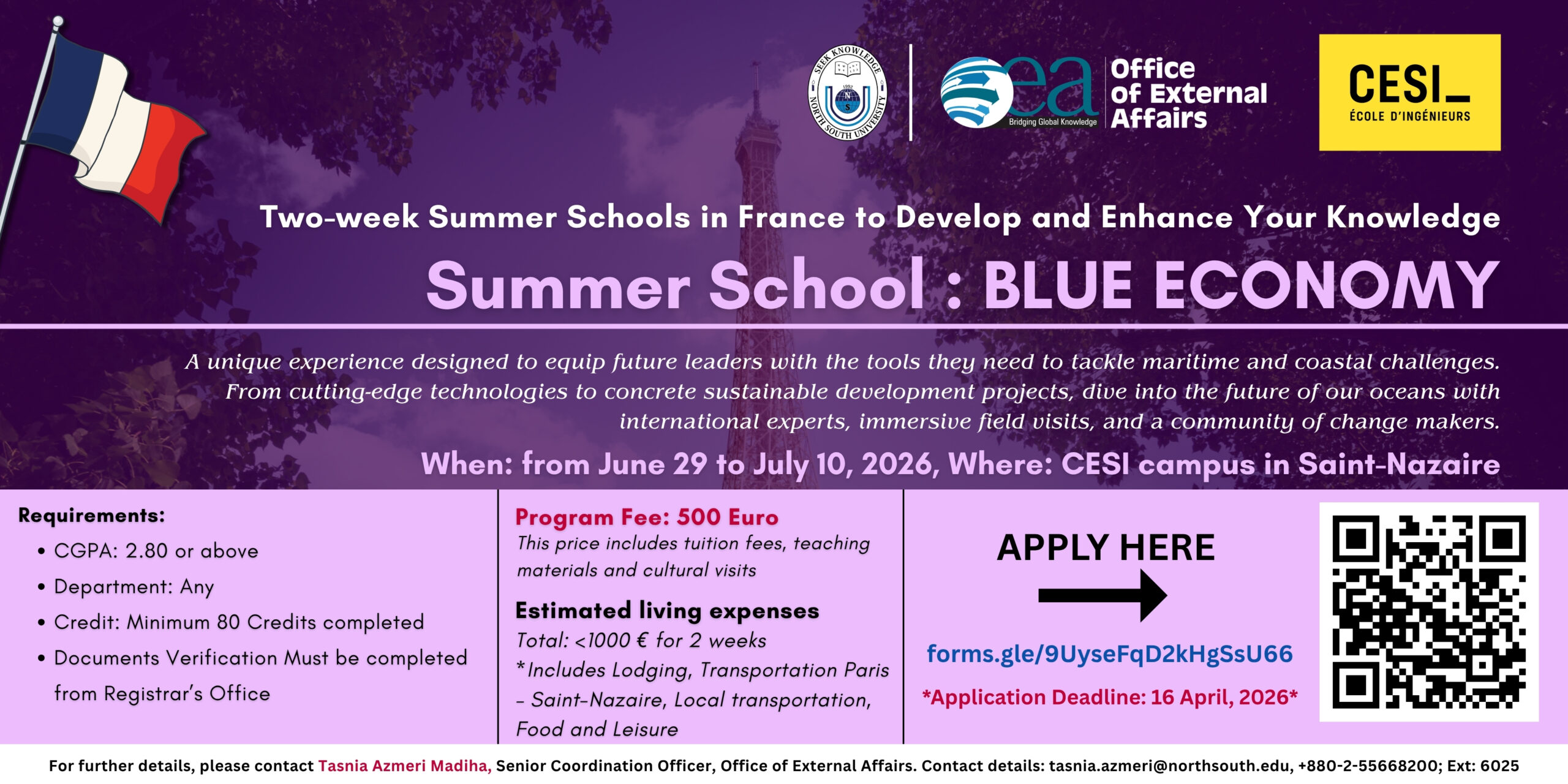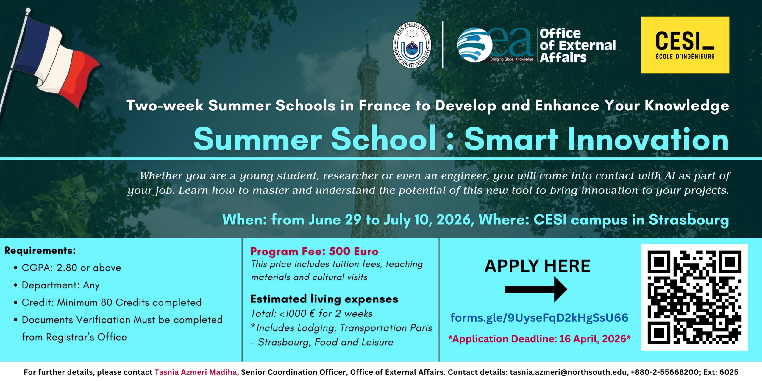For further details, please contact: Tasnia Azmeri Madiha, Senior Coordination Officer, Office of External Affairs  tasnia.azmeri@northsouth.edu  +880-2-55668200; Ext: 6025